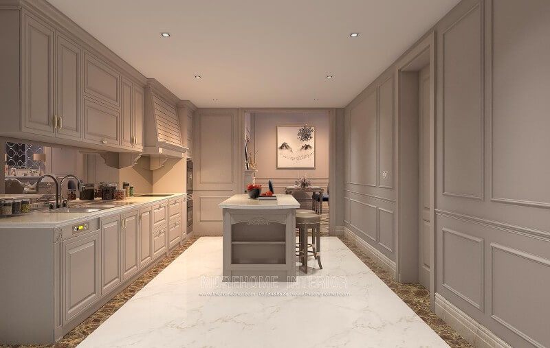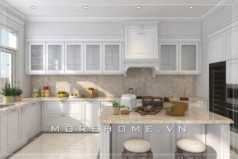 Mẫu tủ bếp đẹp gỗ tự nhiên thiết kế tân cổ điển màu trắng tạo điểm nhấn ấn tượng, sang trọng cho không gian phòng bếp biệt thự.