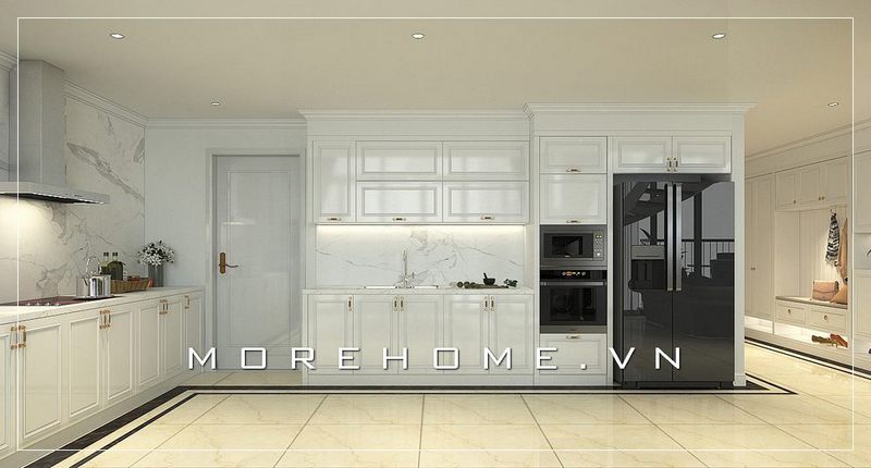 Thiết kế nội thất tủ bếp sang trọng và tinh tế với màu trắng tinh khôi, thanh thoát