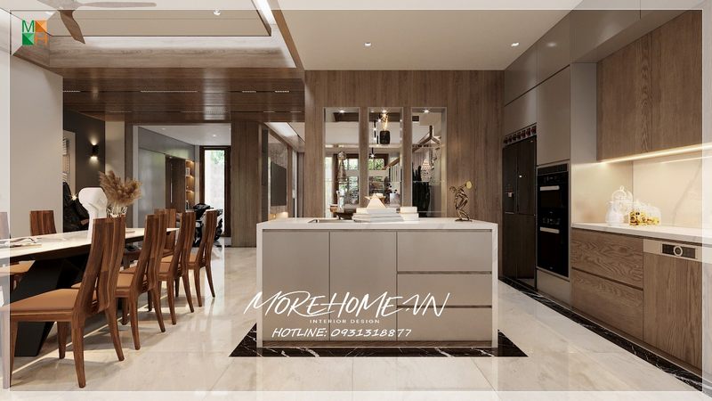Thiết kế nội thất phòng bếp liền ăn gỗ tự nhiên sang trọng với tone màu nâu trầm tạo cảm giác ấm cúng và đẳng cấp