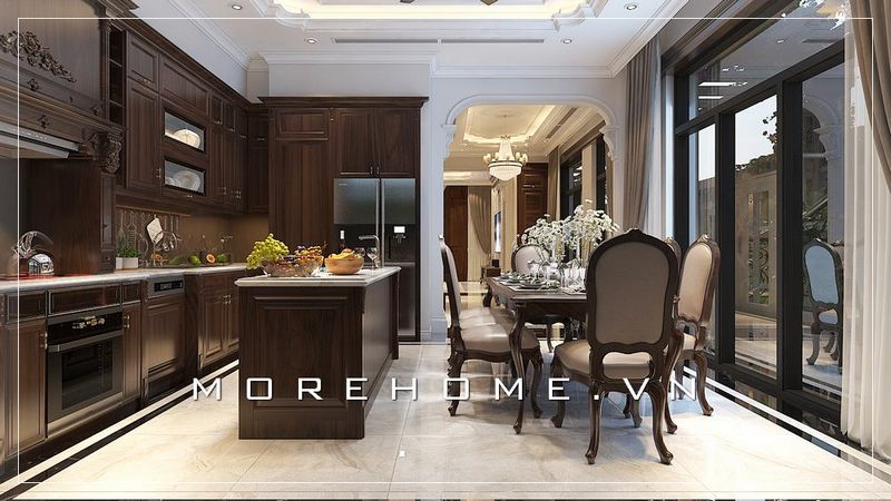 Thiết kế phòng ăn liền phòng bếp tạo sự gần gũi gắn kết giữa các không gian và cũng giúp tiết kiệm diện tích đáng kể, phù hợp cho biệt thự, nhà phố, chung cư cao cấp phong cách tân cổ điển.