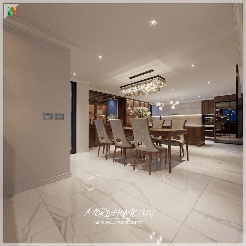 Thiết kế không gian phòng bếp liền phòng ăn rất rộng rãi và thoáng mát, sử dụng đèn chùm treo giữa không gian bàn ăn mang đậm chút tân cổ điện rất đẳng cấp.