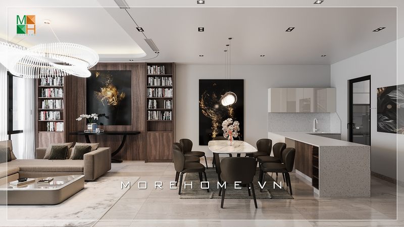 Thiết kế nội thất phòng ăn liền phòng bếp đẹp, sang trọng theo phong cách đương đại.