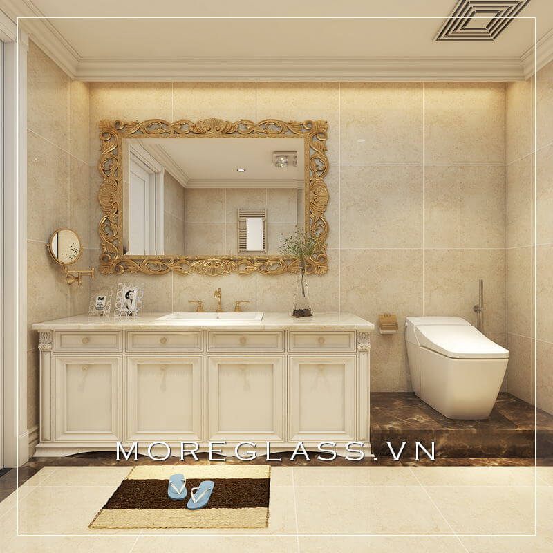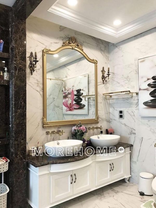 Khi nhìn vào không gian phòng tắm này, bạn sẽ bị thu hút bởi chiếc gương lớn hình chữ nhật với khung viền họa tiết uốn lượn cao cấp, đại diện cho cảm nhận của người gia chủ khi được MoreHome tư vấn.