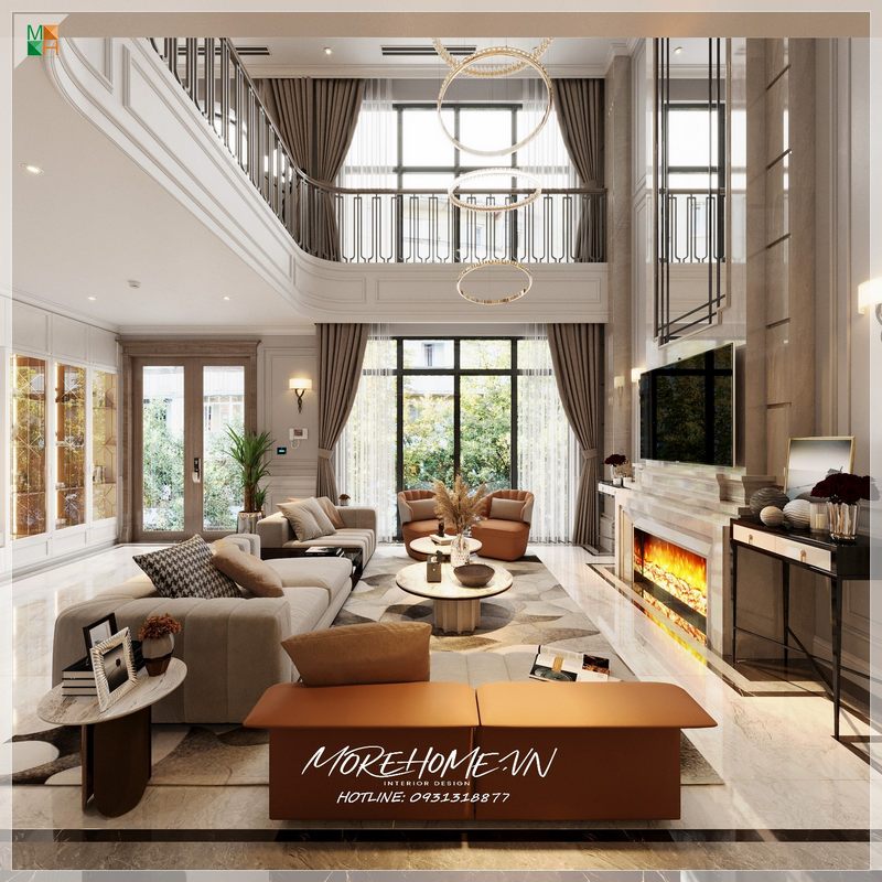 Bộ bàn ghế sofa gỗ óc chó tân cổ điển được làm từ chất liệu nhung vàng ánh, mang lại sự hút mắt và đặc biệt hơn nữa là tạo nên một điểm nhấn ấn tượng cho phòng khách chung cư thông tầng.