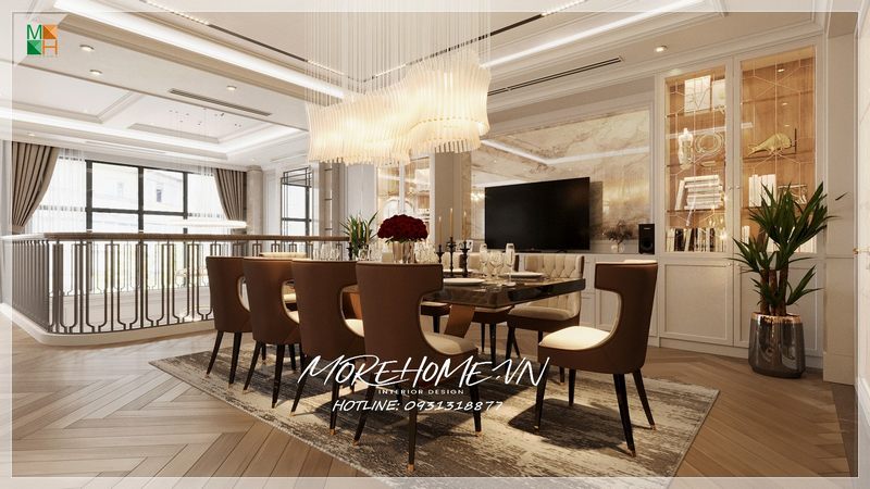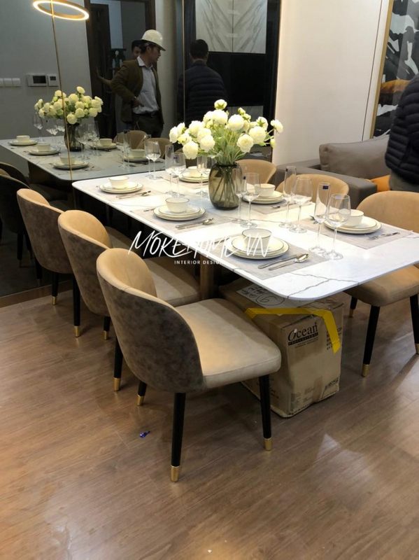 Morehome đã nhập khẩu và sản xuất bộ bàn ăn mặt đá màu trắng vân mây với 6 ghế chất lượng cao từ đá nhân tạo.