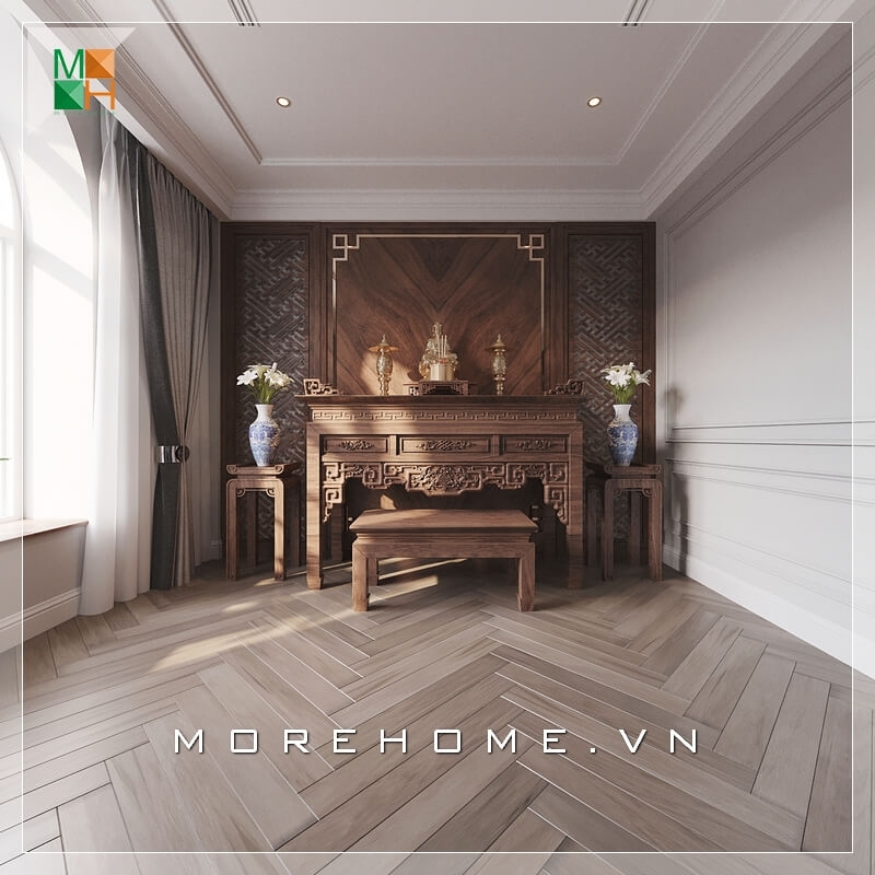 Chất liệu chính căn phòng thờ là gỗ óc chó tự nhiên cao cấp, sàn lát gỗ làm tăng sự sang trọng và sự đầu tư của gia chủ vào không gian nơi đây.