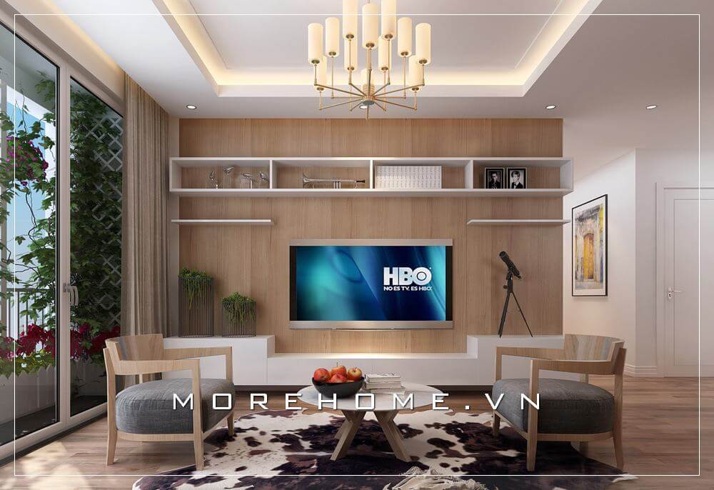 Gỗ ốp tường tạo điểm nhấn ấn tượng cho phòng khách hiện đại căn hộ chung cư.